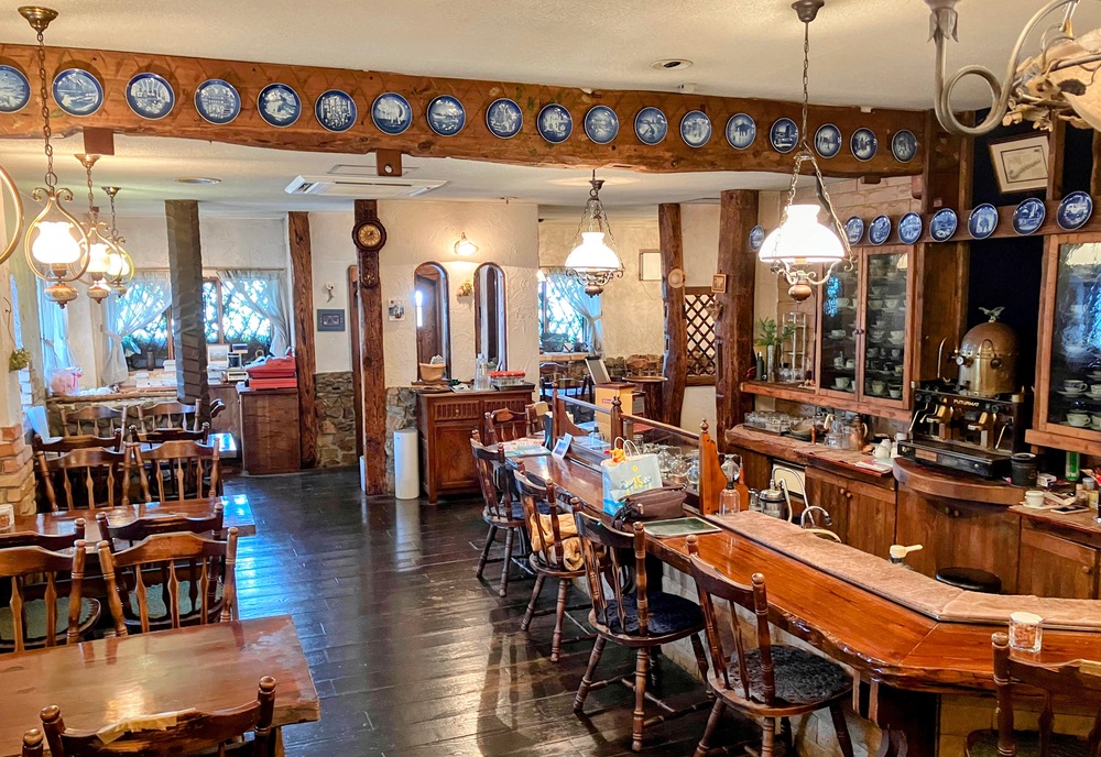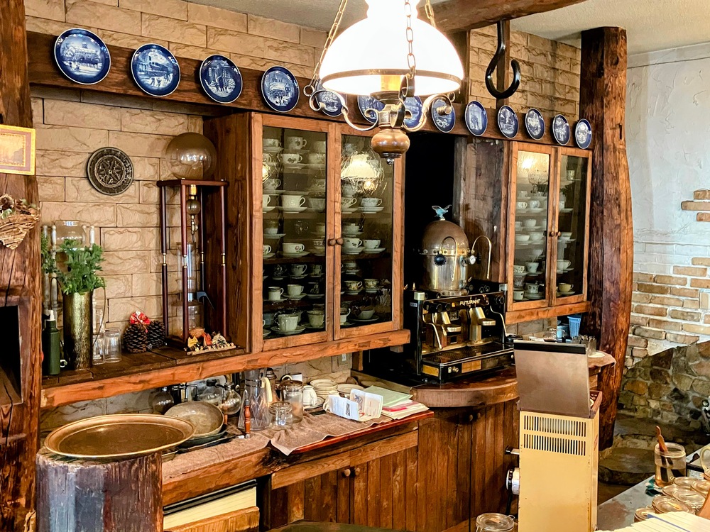 本当に絵本の世界に入り込んだような気持ちになりますね。レンガ造りの壁に木でできた家具、そして壁には絵皿が飾ってあって、とてもメルヘンチックな雰囲気を感じられる空間です。