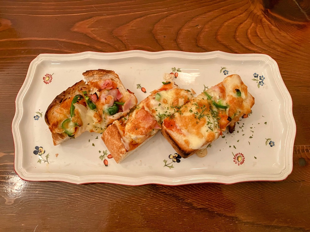 なんともかわいらしいお皿にのってきましたよ!ベーコンにピーマン、玉ねぎにチーズが乗っているシンプルなピザトーストで、大変おいしかったです!