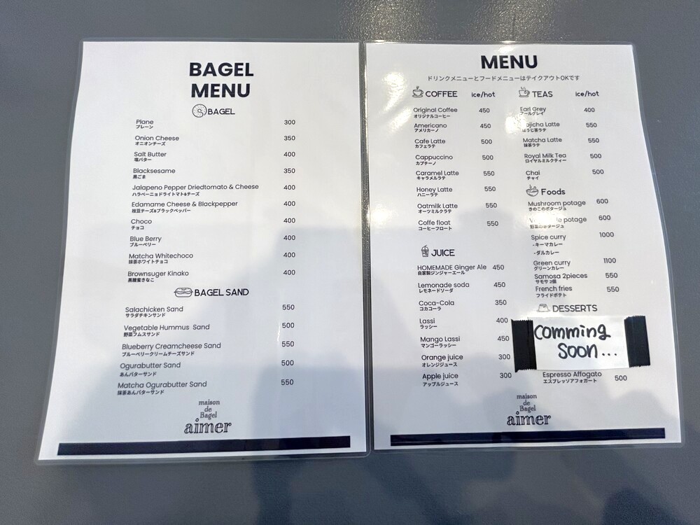 メニューはこんな感じです。私はブルーベリー味のベーグルとカフェラテを注文しました。