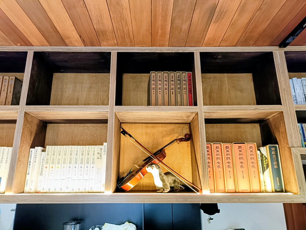 お店の一角には、ぬいぐるみとバイオリンが飾られていました。