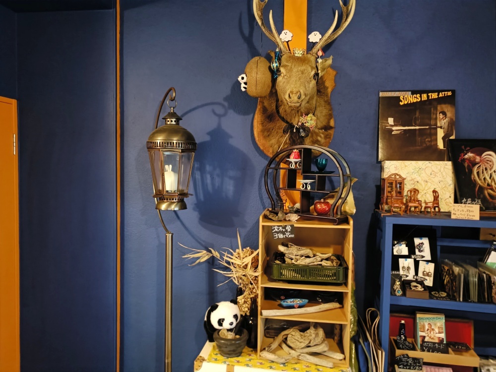 流木の置いてある棚の上に掛かっている剥製は、さすがに売り物ではないと思います。