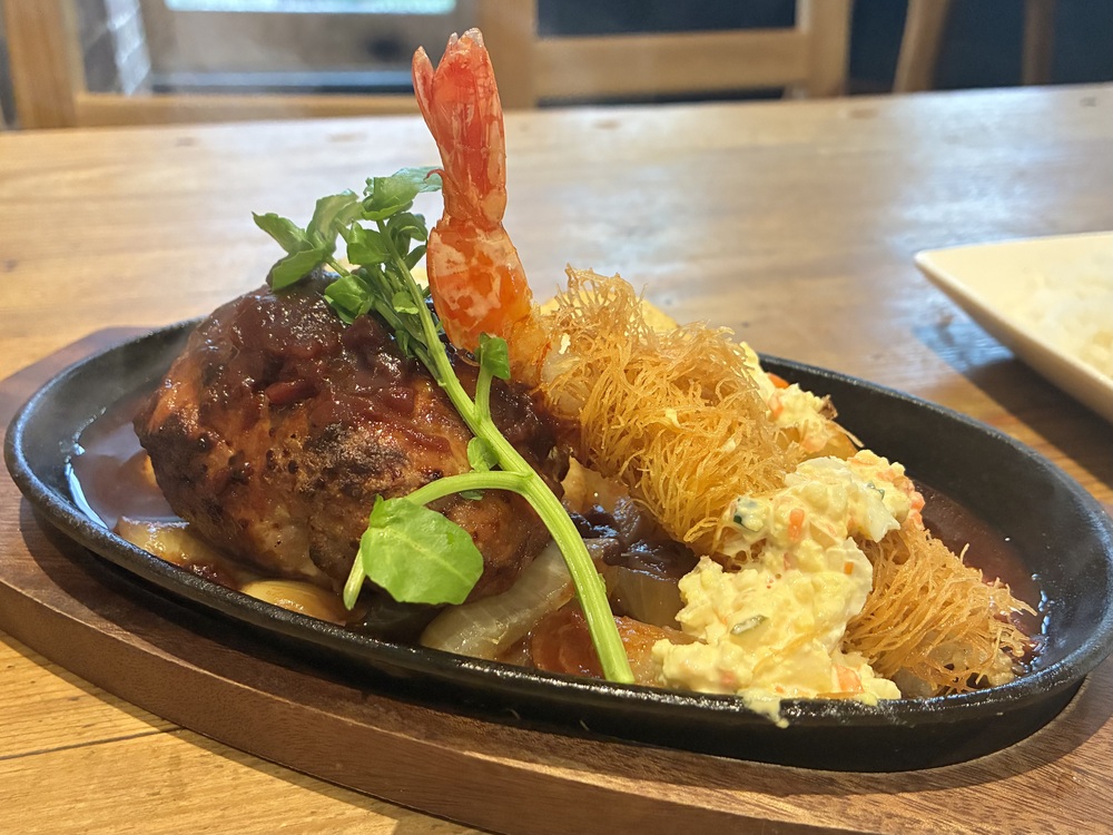 ハンバーグは肉汁たっぷりでボリューム満点。ナイフを入れるとジュワッと肉汁が広がります。しっかりとした肉の旨みが感じられ、ごはんが進む味わいです。