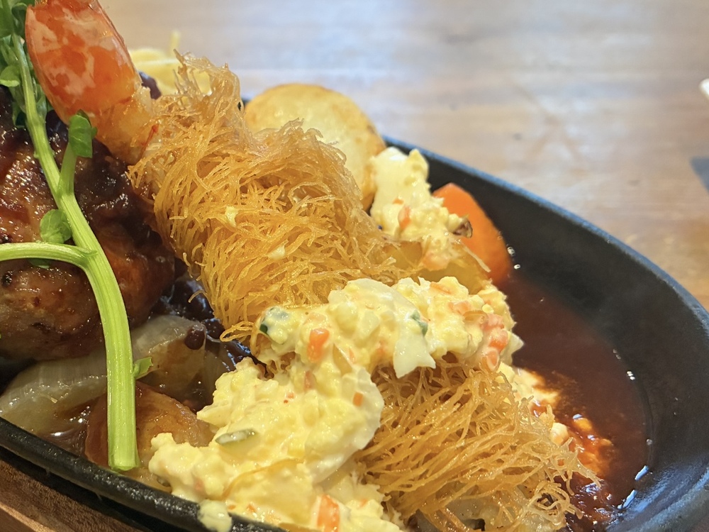 お店の人気No.1メニューで、ディナータイムで一番人気の「海老パリフライ」がドンとのった贅沢な一皿です。ソースは間違いないおいしさのデミグラスソースがかかっています。