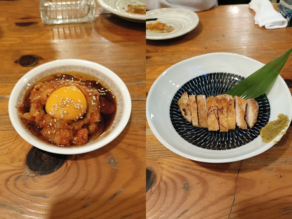 それなら軽くいくつか頼もうかとオーダーしたのが、カレイのえんがわユッケと大山鶏のゆずこしょう焼きです。