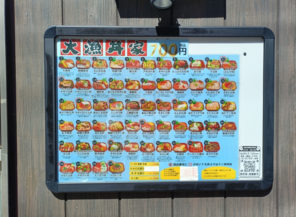 お店の前には注文できる海鮮丼のメニューがあるのですが、まずはその種類の多さに驚きます。