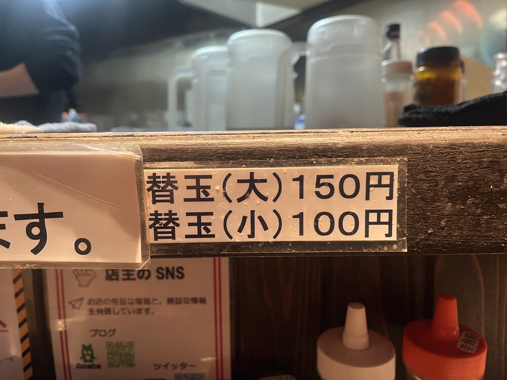 もちろん替玉も頼めます。替玉(大)は150円、(小)は100円で注文できるので、物足りないという方は安心して頼めますね!