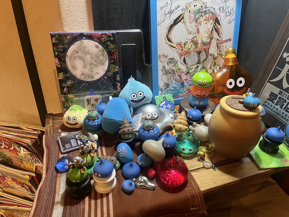 奥様が集め始めたのがきっかけで、今ではスライムグッズでいっぱいです。たくさんのスライムを見てるとなんだか癒されますね。私も昔ゲームでたくさんスライムを見てきたので、懐かしさを感じました。