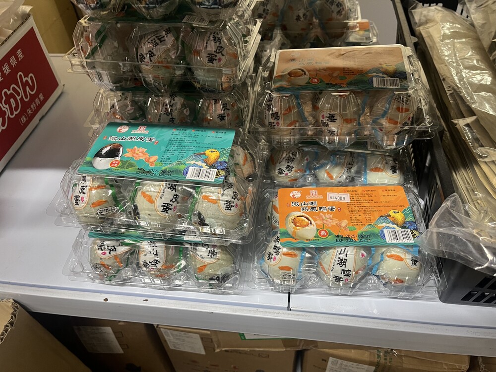 また、アヒルのたまごも人気だそうで、こちらは中国人にも人気の商品です。見た目は鶏のたまごよりも大きく、模様もまだらにあるのが特徴です。