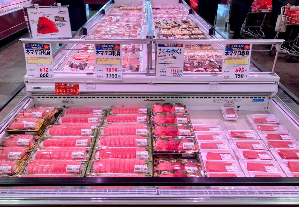 先ほどは新鮮な魚や貝類を紹介しましたが、もちろん刺身用に加工された物もございます。写真の通り、マグロの刺身だけでもこれだけの種類が販売されているんです。